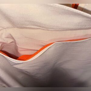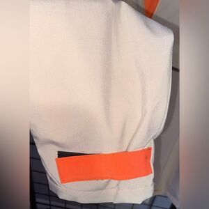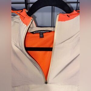 Men’s Amazon essentials jacket in cream and orange. It’s a pullover with quarter zip front. Has a single chest pocket. Sleeves and hood can be adjusted. Moisture wicking lightweight fabric. Relaxed fit throughout. NWT