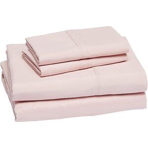Enhance your bedroom with the Amazon Basics Microfiber Bed Sheet Set. This blush pink, full-size set includes a flat sheet, fitted sheet, and two pillowcases, crafted from lightweight, breathable microfiber with 14-inch deep pockets for a snug fit.