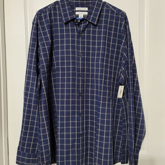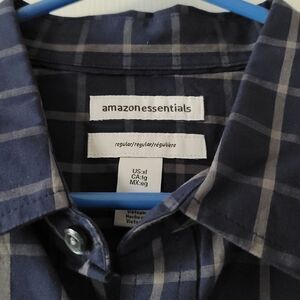 NWT. Very nice blue and light tan checkered, button down shirt by Amazon Essentials. It is a Regular fit. The measurements are: Pit to Pit is 26", Length is 33".