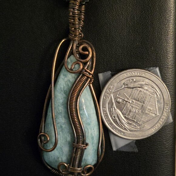The amazonite crystal, often called the "Stone of Courage" and the "Stone of Truth," is believed to possess a variety of healing properties. The copper wire wrapping is sometimes incorporated into the belief system, as copper is considered a natural conductor of energy.