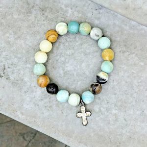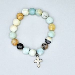 Amazonite Cross Bracelet Natural Stone Silver Tone Religious Spiritual Jewelry. Bracelet is 7" stretch, unsigned. Beads are approximately 11mm. In good pre-owned condition.
