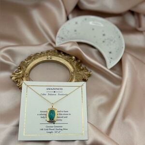 Elegant gold plated necklace featuring a stunning amazonite gemstone. Perfect for adding a touch of color and elegance to any outfit.