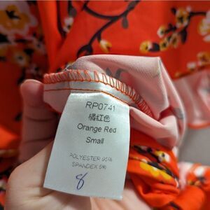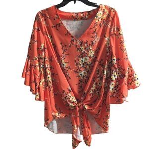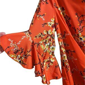 Amazon orange red floral ruffle bell sleeve tie front v-neck hi-lo blouse top S
