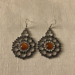 These earrings are round andIn the shape of a flower. In the middle of the flower, is an amber color stone surrounded by crystals.