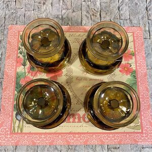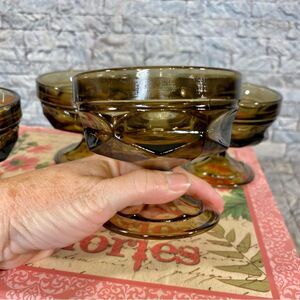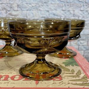 This is a set of 4 amber colored sherbet glasses. Could be used as a champagne or cocktail coupe or for dessert. This set is in great condition and would make a beautiful addition to your home bar!