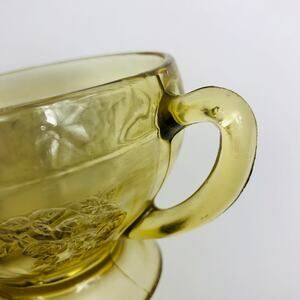 The pretty pressed glass is pale yellow or amber in color and the official pattern name is Sharon but commonly called Cabbage Rose