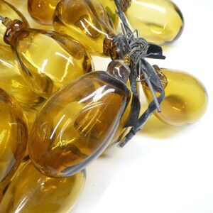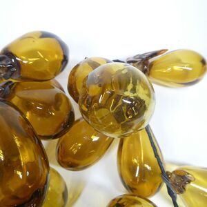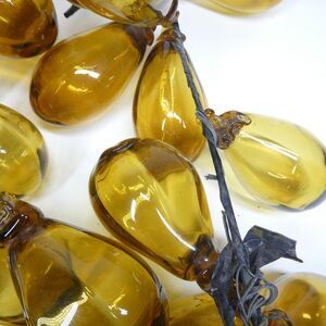 Lot of vintage blown glass grapes. These grapes are amber/yellow-brown in color, and are quite large examples, at about 3 inches long. They are grouped together on wires covered in electrical tape.