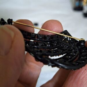 This is a beautiful set by M Jent Jewelry. This is on a black metal base with gorgeous amber glass rhinestones bezel set against a sweeping feather like arch. The earrings are a double row arch. This is a stunning set and not something you see very often. I do believe the pin has been replaced, but the everything else is in very nice condition. The brooch is 2.75" long and the earrings are 1". this piece can upcycle just about any outfit to make it more elegant.