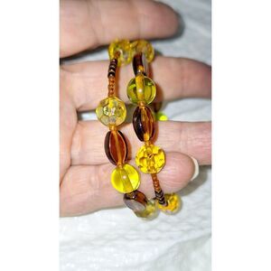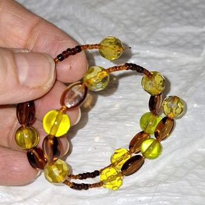 This is a really pretty memory wire wrap bracelet. This has glass beads, some of them are an amber color, some of them are a yellowish color, and the others are faceted and have AB coating on them to add some sparkle. This piece is in really nice pre-owned condition and has a really great look.
