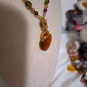 This is an interesting beaded necklace. The pendant appears to be a piece of amber glass, possibly stone, with a beaded chain that contains more amber color and some green. This is unique and fun. The chain is a very dark color with a lobster claw clasp. There is almost a mystical quality to this piece. It is 14" long with a 3" extender. It is in very good pre-owned condition.