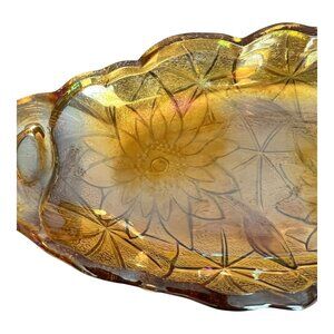 This oval dish showcases an intricate sunflower design in amber marigold carnival glass, blending functionality with vintage elegance.