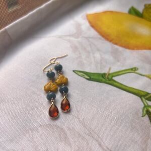 Gold dangle earrings feature amber maple brown crystal glass drops, deep blue jade beads, and olivine yellow maple fall-autumn leaf themed Czech glass beads. Also available as a set.