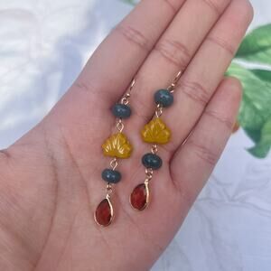 long earrings, long earrings, dangle earrings, cozy fall earrings, holiday earrings, winter earrings, canada earrings, amber earrings, maple earrings, olive green, olive yellow, yellow earrings, mustard yellow earrings, jade earrings, unique earrings, novelty earrings, fall earrings, leaf earrings, maple leaf earrings, autumn earrings, casual earrings, neutral earrings, coquette, preppy, pastel, colorful earrings, wedding, party, coquette, fairy queen, festival, fairycore, cottagecore, anniversary gift, birthday gift, elegant, fairy earrings, vintage style