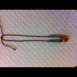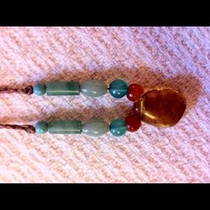 A beige macrame necklace holding a clear yellow Chiapas Amber fossil stone set off by real jade turquoise & amber beads. 12" long with slip knot adjustable closure. Amber stone 1" x 3/4" .
