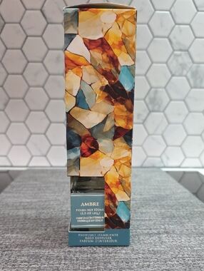The scent profile is built around Amber, which typically offers a warm, resinous, and slightly sweet aroma, often described as cozy or "golden." The packaging is a primary feature, showcasing a vibrant, high-gloss geometric mosaic pattern in shades of amber, gold, turquoise, and deep blue.