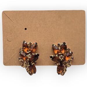 Glamorous and timeless, these vintage clip-on earrings feature warm amber marquise-cut rhinestones arranged in a leafy cluster design. Gold-tone accents and round crystal embellishments add sparkle and depth. With their rich color and retro silhouette, these earrings are perfect for dressing up any look.