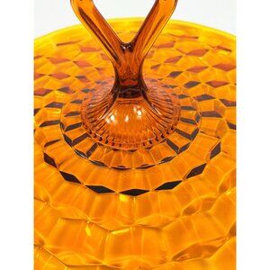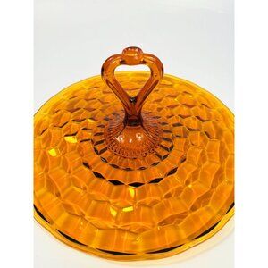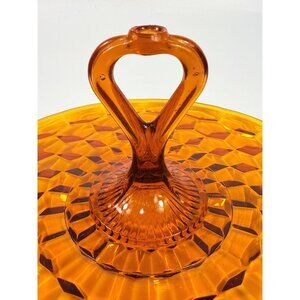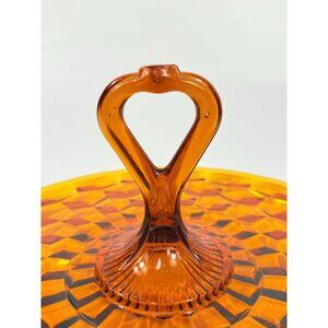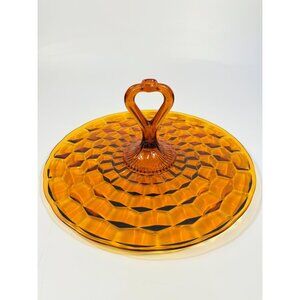 This vintage amber glass serving tray boasts a radiant diamond pattern and a central heart-shaped handle. Ideal for displaying desserts or hors d'oeuvres, it brings timeless charm to gatherings. Its warm amber hue adds a touch of retro sophistication to any table setting.