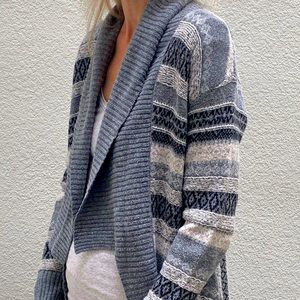 Used. Good condition. Grey and white patterned open front cardigan. Size: XS. Length: measuring from center back: 25.5 inches. Arm pit to arm pit: 16.5 inches.