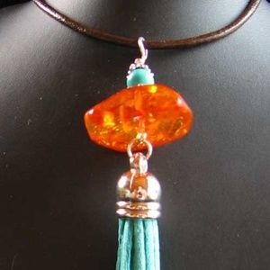One of my little Tassel creations. Natural Amber and Turquoise Bead Pendant. Strung on long leather cording. Ready for a fun night out?