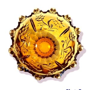 Unique rare Vintage Amber glass dish with scalloped edge and flower pattern.