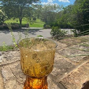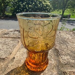 This amber drinking glass is stunning with it’s precious floral pattern. This is a vintage item that may have flaws