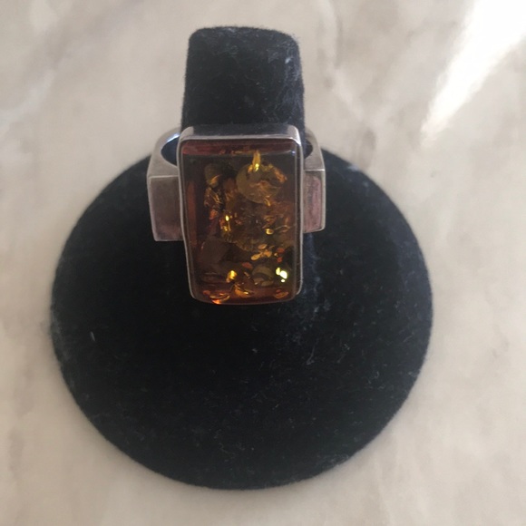 Amber rectangular silver ring