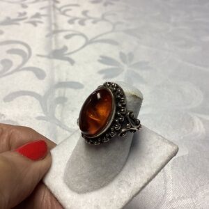 This is a beautiful Amber ring. I’m describing it is a Victorian setting. It looks so elegant very ladylike very feminine. It is a size 5. It is a sterling gorgeous beautiful Amber ring. The inclusions are beautiful. When set up to the light and as you can see I’ve taken many pictures of the design list price was 145 all of the items that we have in our jewelry revolve. We do try to discount for a reasonable price somewhere bought a long time ago, and the prices certainly have gone up in Sterling so we’re selling this it much less than what we paid positively beautiful Sterling Amber ring a must have these look nice on the pinky finger as well