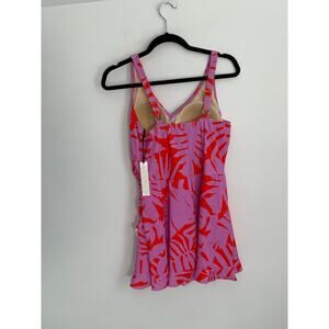 Features: palm leaf print, bra cups, wide adjustable back straps with oval slider, faux wrap front, self brief attached at waist seam, ruffle hem, UPF 50, chlorine-resistant