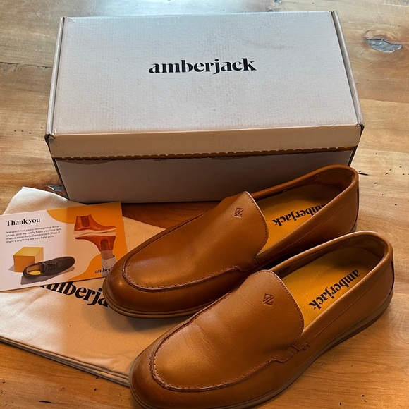 Step into sophistication with Amberjack's tan leather slip-on loafers. These shoes offer a perfect blend of style and comfort for any occasion.