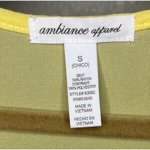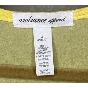 The Ambiance Apparel Tunic Tank Top in women's size small is a stylish and vibrant addition to any wardrobe. 18 inches from pit to pit laid flat. This sleeveless top features a scoop neckline and a pullover closure, making it perfect for casual occasions. The yellow color adds a pop of brightness, while the semi-sheer back chiffon fabric adds a touch of elegance. Made from a blend of polyester and rayon, this lightweight top is designed for comfort and breathability, making it a great choice for warm weather or beach-themed outfits. Perfect for any fashion-forward woman looking for a versatile and trendy piece.