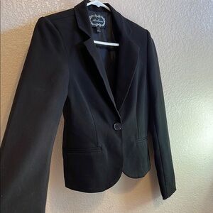 The Ambiance blazer showcases a refined tailored fit with notched lapels, crafted from a deep black fabric. Its structured silhouette and cropped length make it perfect for professional and formal occasions, offering a polished and sophisticated appearance.