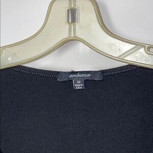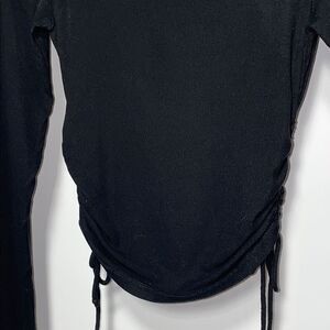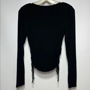 This black long sleeve shirt by Ambiance features a sleek, fitted design with elegant ruching along the sides, offering a flattering silhouette. The long sleeves and stretchy material provide both style and comfort, making it a versatile addition to any wardrobe.