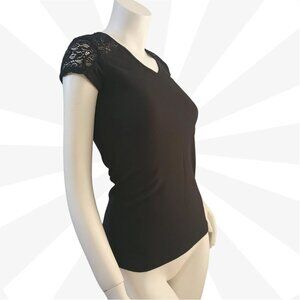 The Ambiance Black Lace Cap Sleeves V Neck Knit Top in size S is a stylish and versatile piece perfect for travel or casual occasions.