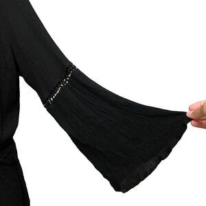 Ambiance Boho Crinkle Gauze Romper in Black, bell sleeves, cotton lace trim at neckline and upper sleeve, elastic waist