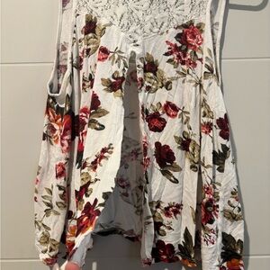 This stylish tank top from Ambiance features a cream base with vibrant red floral accents, offering a chic asymmetrical design with a tie front. The lightweight fabric and sleeveless style make it perfect for a relaxed, yet fashionable look.