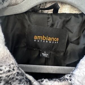 Great condition. This Ambiance Outerwear plaid jacket in black, gray, and cream tones is perfect for adding warmth and style to your winter wardrobe. It features a cozy blend of 84% polyester, 10% cotton, 2% wool, and 1% nylon, with a 100% polyester lining for added comfort. The jacket has a button-up front, two front pockets, and a relaxed, slightly oversized fit that’s ideal for layering.
