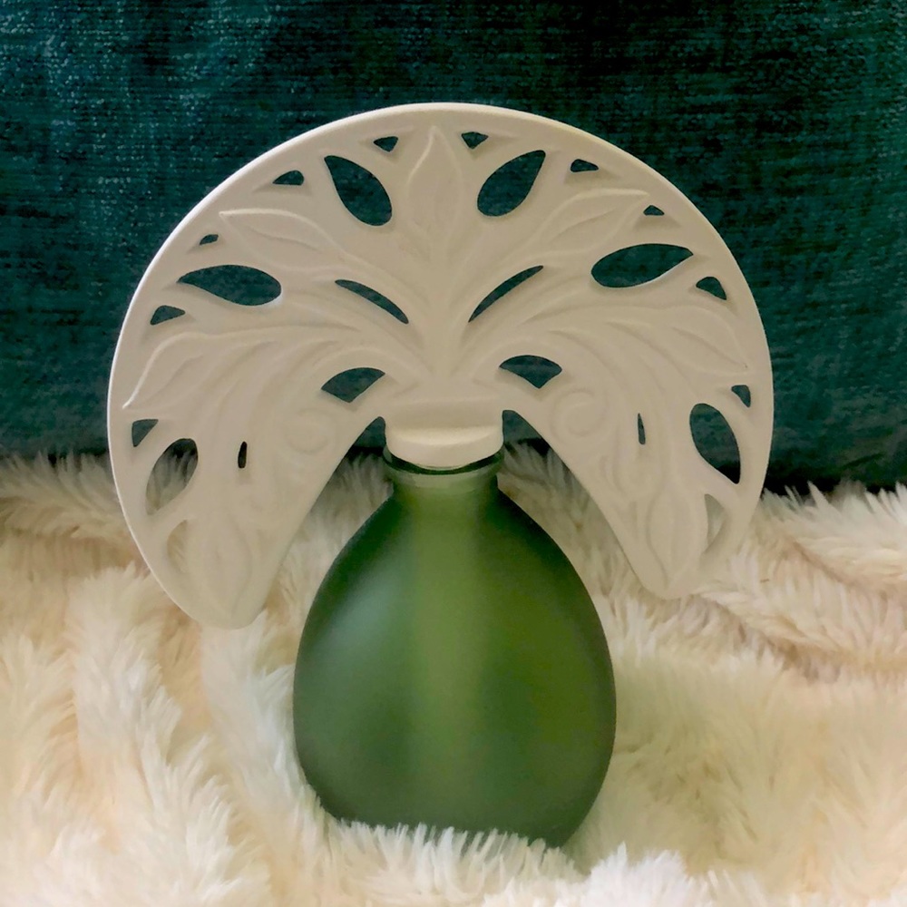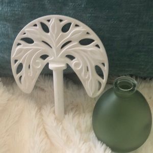 The Ambiance Reed Diffuser incorporates a delicate ‘porcelain’ sculpted ‘leaf design’ topper that throws fragrance as a more decorative alternative to the bamboo reeds we are all accustomed to. This is a beautiful look for any room in your home or apartment. Use your favorite essential oil fragrance to set the mood. It has never been used with a fragrance; only as a decorative piece.