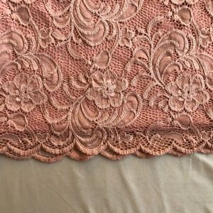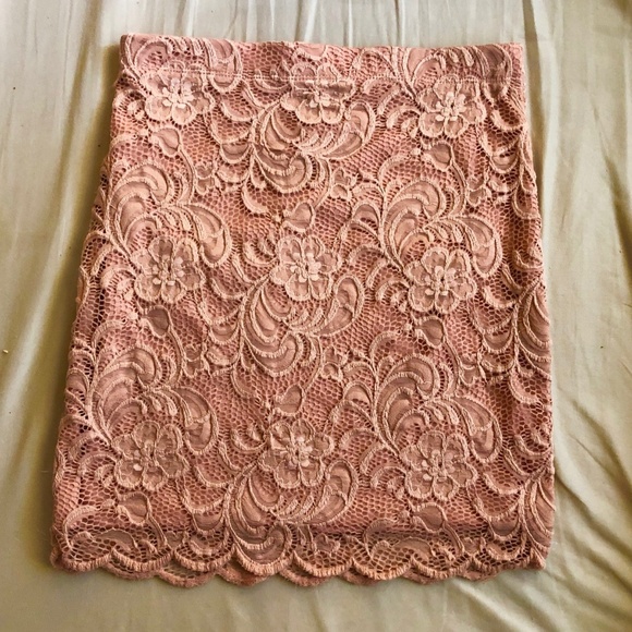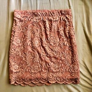Lace Mini Skirt Hip hugging mini skirt features a textured floral lace overlay with lining. Scalloped hem.