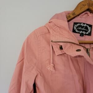 Features: pink, zip up, snap buttons, hood, Drawstring hem, adjustable, slash pockets, utility