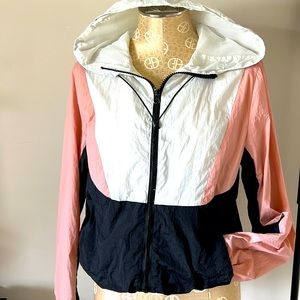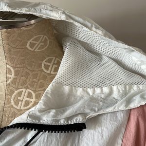 Ambiance Water Resistant Jacket in Dusty Rose, white and Black color. Material is 100% Nylon and water resistant. Mesh on inside hood with outer slit pockets. There's a small dot near the front zipper (see photo). It was there when purchased. Plastic pull cap missing on right side (see photos). In excellent condition, no tears or stains. Cleaning out closet.