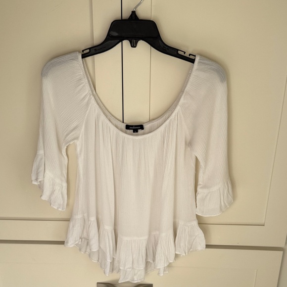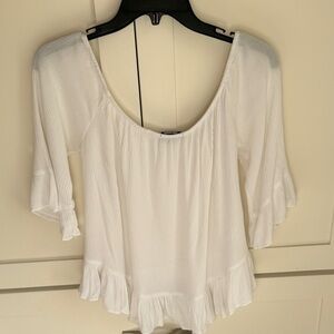 Elegant white blouse with ruffled hem. Soft fabric. Perfect for casual outings.