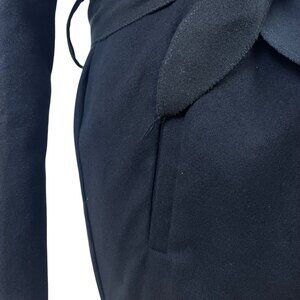 Ambiance Women's Black Polyester Coat Size M with a sleek open-front design and belt closure. Made from durable polyester, this coat ensures both style and comfort. Excellent used condition showing no flaws, defects, or damage. Timeless black design complements various outfits for cooler seasons.