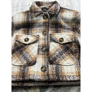 "Stay on-trend with this stylish Ambiance plaid cropped shacket. This women's size medium piece is a true-to-size fit, perfect for layering during the fall and spring. It features a classic plaid pattern in a versatile color palette of brown, black, and white. The jacket has a button-front closure, two functional chest pockets, and a pointed collar, blending the look of a shirt with the warmth of a jacket. The cropped length is perfect for pairing with high-waisted jeans or skirts. Worn once and in excellent, like-new condition. A perfect addition to any casual or streetwear-inspired wardrobe."