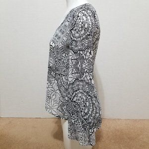 Ambiance top Small semi sheer floral geometric print split back bell sleeve