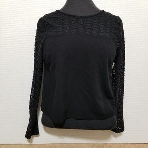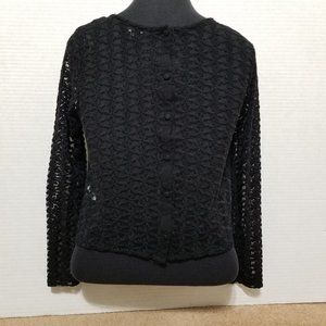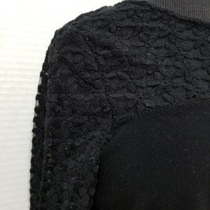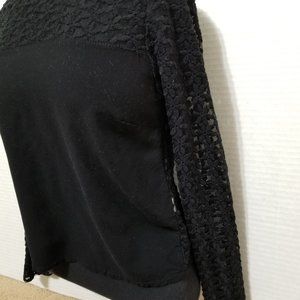 Unlined floral lace button up (button down) back top. (Kind of like a backwards cardigan style!) Solid front with floral lace upper. Lace sleeves.