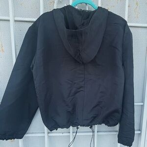 Ambiance women's size L hooded jacket. Mesh lined 2 slip-in pockets. Elastic string st hem for adjustment. Black with Burgundy & white strip st chest area. 100% polyester armpit to armpit 22"