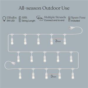 🧿Energy Saving LED Outdoor String Lights: 48 ft long string lights with 15 energy saving, high efficiency 2 watt LED standard base bulbs. 3' between bulbs and up to 20 strands for connections. Brightech porch string lights are approved for residential and commercial lighting and they never get hot even after being on for hours. (Please NOTE: Bulbs are dimmable, dimmer sold separately. Made for use with 110v only.)