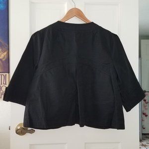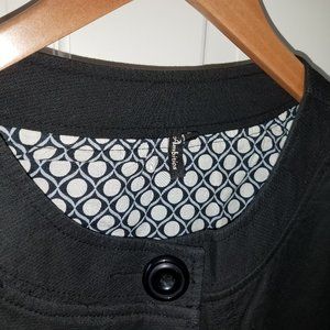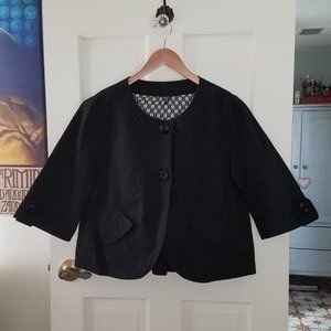 Great 1960's retro styling, trapeze/swing jacket! "Ambition" brand from Nordstrom, about 15 years old. Hardly worn, EUC. Black birdseye fabric has diagonal stretch. 97% cotton/3% spandex. Back pleat. Decorative flap faux pockets. Looks fab with a pencil skirt or jeans!