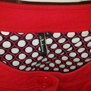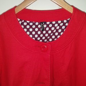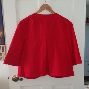 Great 1960's retro styling, trapeze/swing jacket! "Ambition" brand from Nordstrom, about 15 years old. Hardly worn, EUC. Perfect red birdseye fabric has diagonal stretch. 97% cotton/3% spandex. Back pleat. Decorative flap faux pockets. Looks fab with a pencil skirt or jeans!