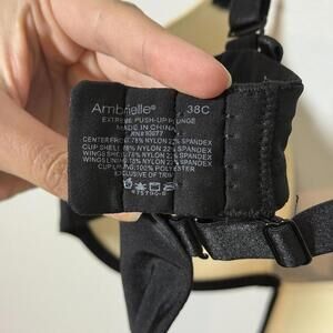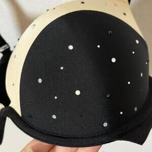 Glam meets support in this Ambrielle extreme push-up plunge bra. Black and nude colorblock with scattered rhinestones for a subtle sparkle. Smooth molded cups with plenty of lift, adjustable straps, and classic underwire shape. Missing a few rhinestones, but they're hardly noticeable — still a gorgeous piece!